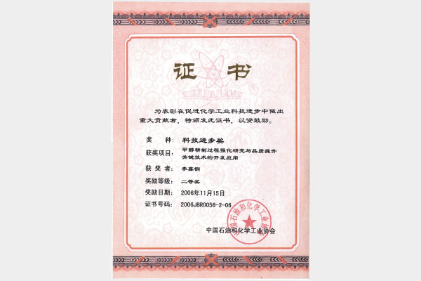 甲醇精制過(guò)程強(qiáng)化研究與品質(zhì)提升關(guān)鍵技術(shù)的開發(fā)應(yīng)用中國(guó)石油和化學(xué)工業(yè)協(xié)會(huì)科技進(jìn)步獎(jiǎng)三等 -