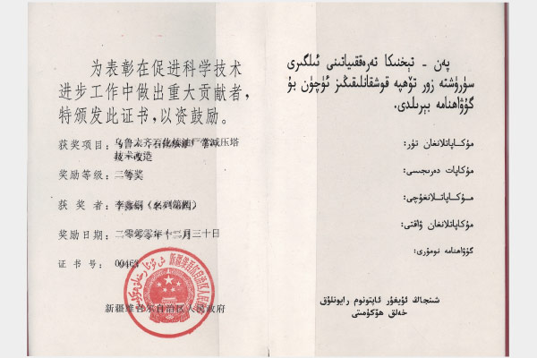 烏魯木齊石化煉油廠常減壓塔技術(shù)改造新疆維吾爾自治區(qū)人民政府科技進(jìn)步獎(jiǎng)二等 -