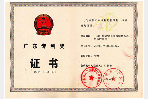 一種以裂解為原料制備石油樹脂的方法廣東專利金獎(jiǎng)