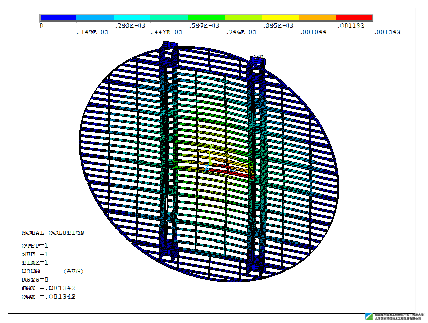 通過動態(tài)力學(xué)計算,對塔內(nèi)件進(jìn)行操作狀態(tài)下的機械性能分析,主要針對大型塔器中塔盤結(jié)構(gòu)強度、集油箱結(jié)構(gòu)強度、內(nèi)件的支撐部件如支持板和支撐梁等強度的計算與分析,在此基礎(chǔ)上優(yōu)化塔內(nèi)件結(jié)構(gòu),實現(xiàn)微形變控制,保證了內(nèi)件的機械性能和內(nèi)件的水平度要求,以滿足工藝要求。