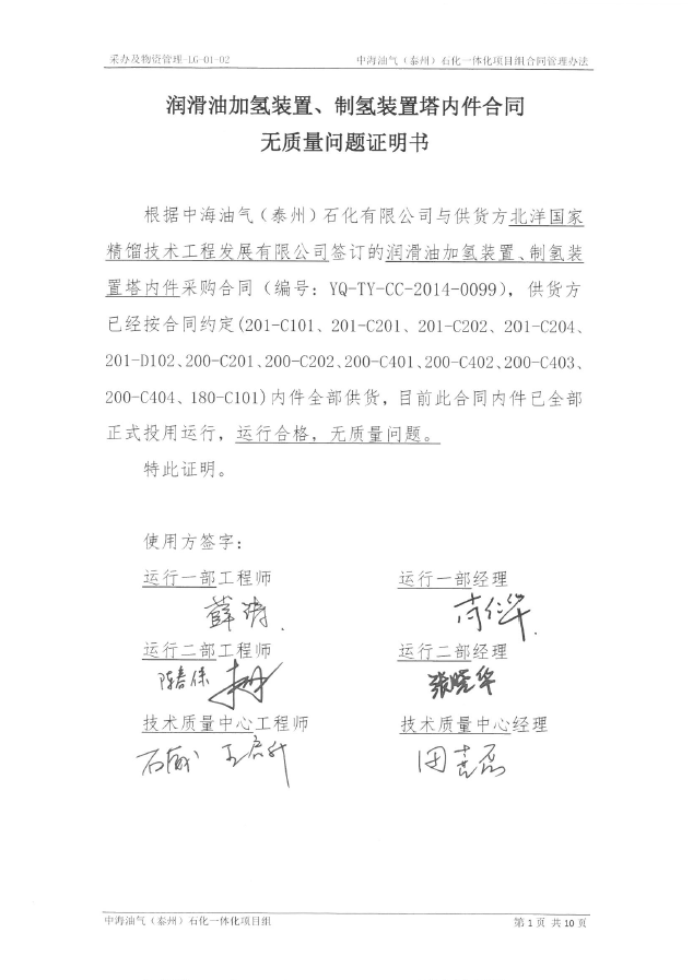 中海油泰州潤(rùn)滑油加氫運(yùn)行評(píng)價(jià)